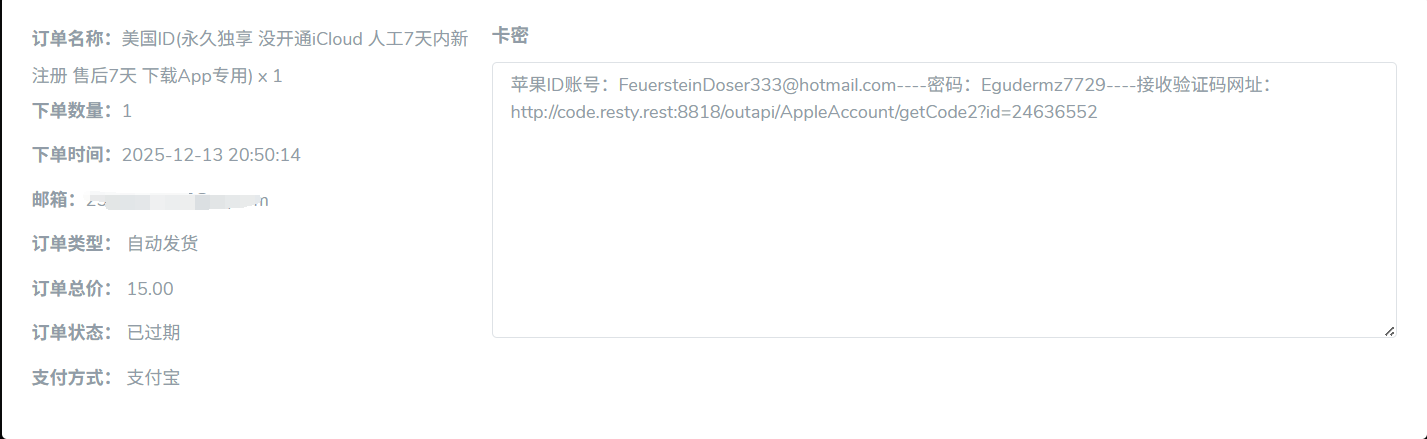 选择支付方式-支付宝/微信-提交订单-确认订单信息后,电脑上会跳转到扫码界面,扫码成功之后,网页会自动跳出购买的苹果id账号密码